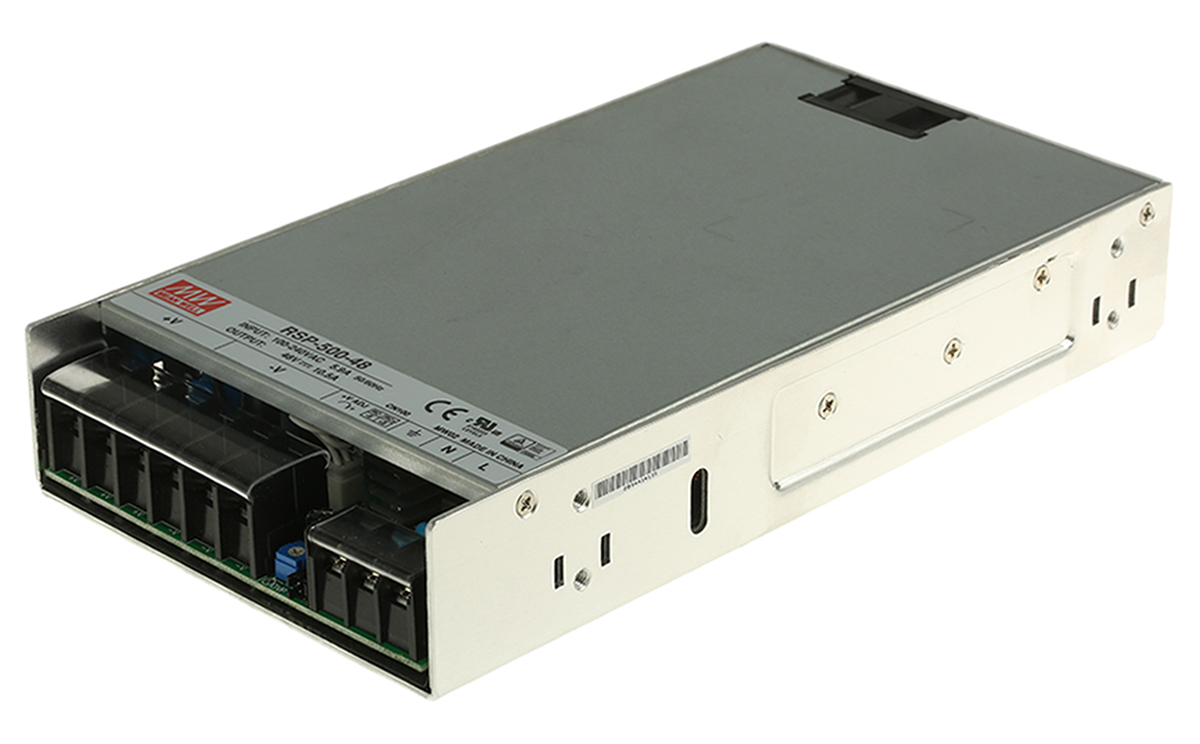 This is 504W Embedded Switch Mode Power Supply SMPS 10.5A 48V dc manufactured by Mean Well. The manufacturer part number is RSP-500-48RS. Additionally, the product is supplied with 1 outputs. The product is available in chassis mount configuration. The typical product's weight is 1.3kg. Furthermore, the product is 127mm wide. Its accurate length is 230mm. It is a highly efficient product with an 90.5% of high efficiency. The product comes in 40.5mm depth.