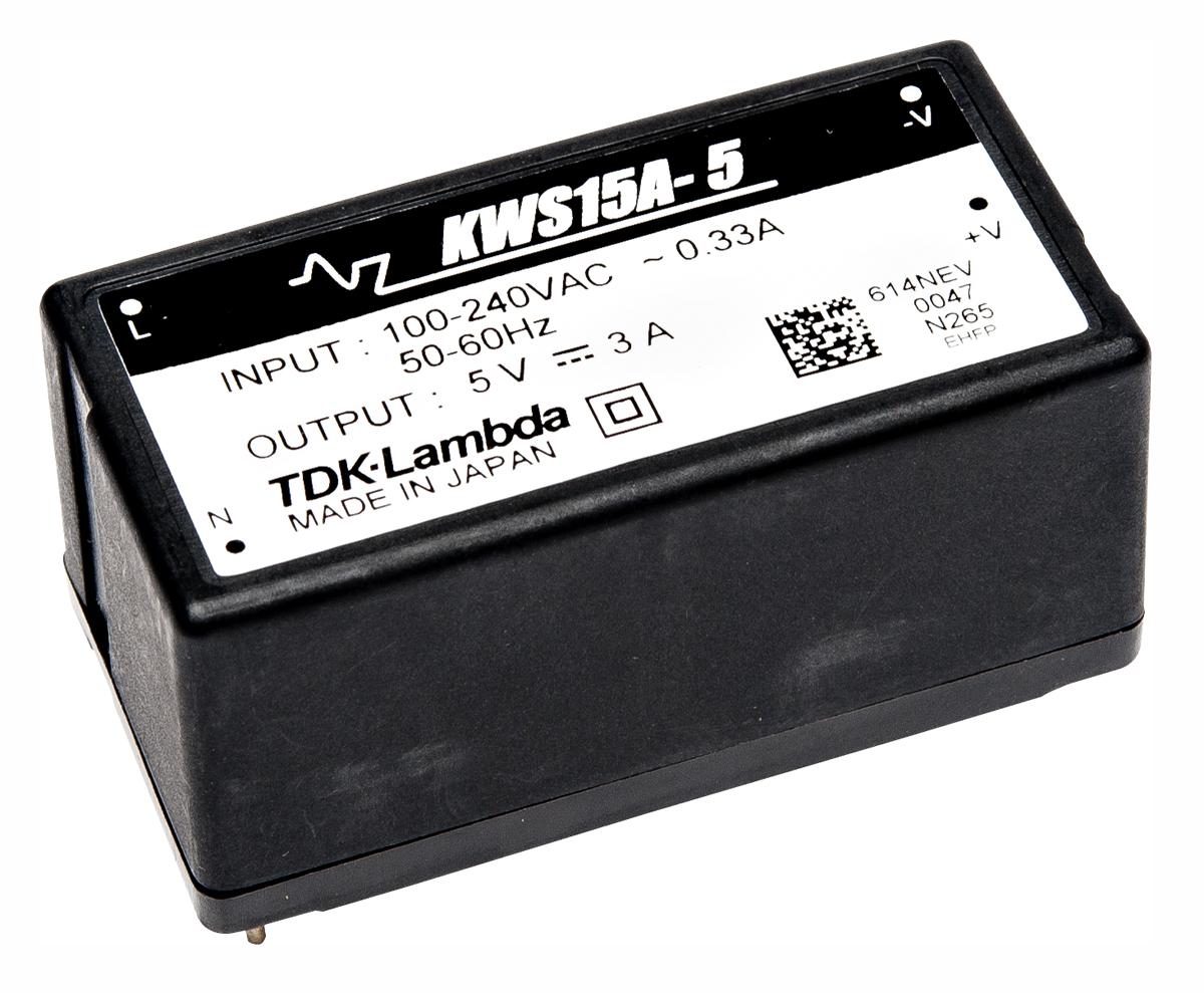 This is Embedded Switch Mode Power Supply SMPS 24V dc 700mA 16.8W Encapsulated manufactured by TDK-Lambda. The manufacturer part number is KWS15A-24. Additionally, the product is supplied with 1 outputs. The product is available in pcb mount configuration. The typical product's weight is 60g. Furthermore, the product is 25.4mm wide. Its accurate length is 50.8mm. It is a highly efficient product with an 85% of high efficiency. The product comes in 24mm depth.