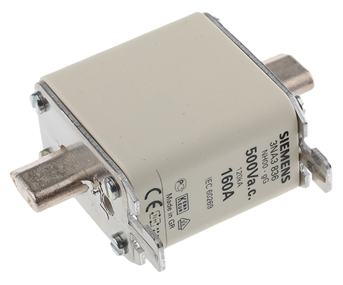 This is 160A 00 NH Centred Tag Fuse gG 500V ac manufactured by Siemens. The manufacturer part number is 3NA3836. The product has a current rating of 160a. Moreover, the product has a nominal 500v ac voltage rating. A fuse with a nh00 size.