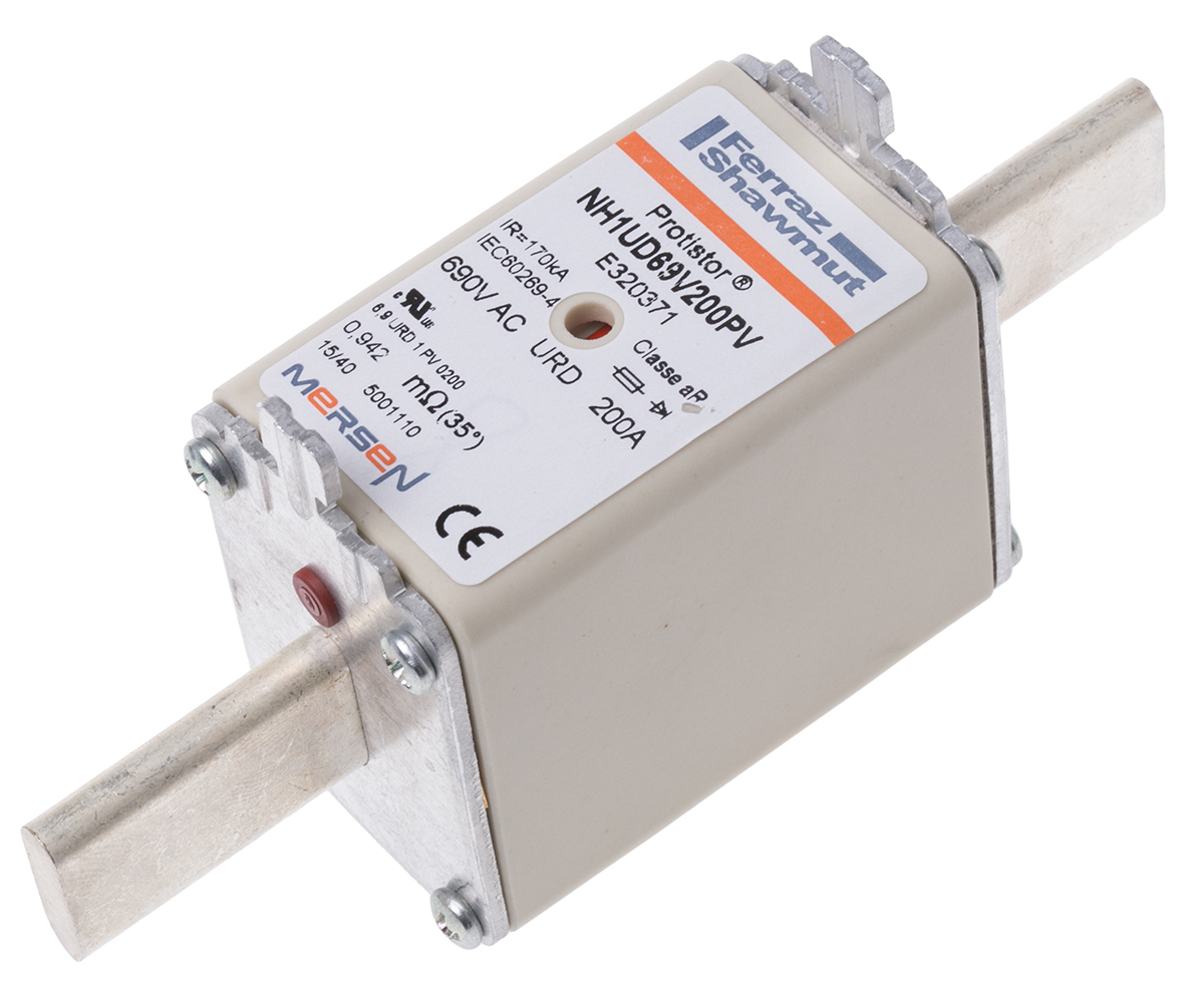This is 200A 1 FF NH Centred Tag Fuse aR 690V ac manufactured by Mersen. The manufacturer part number is E320371. The product has a current rating of 200a. Moreover, the product has a nominal 690v ac voltage rating. A fuse with a nh1 size.