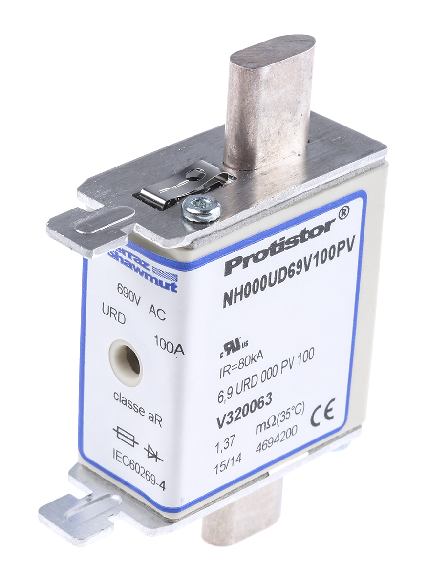 This is 100A 000 FF NH Centred Tag Fuse aR 690V ac manufactured by Mersen. The manufacturer part number is V320063. The product has a current rating of 100a. Moreover, the product has a nominal 690v ac voltage rating. A fuse with a nh000 size.