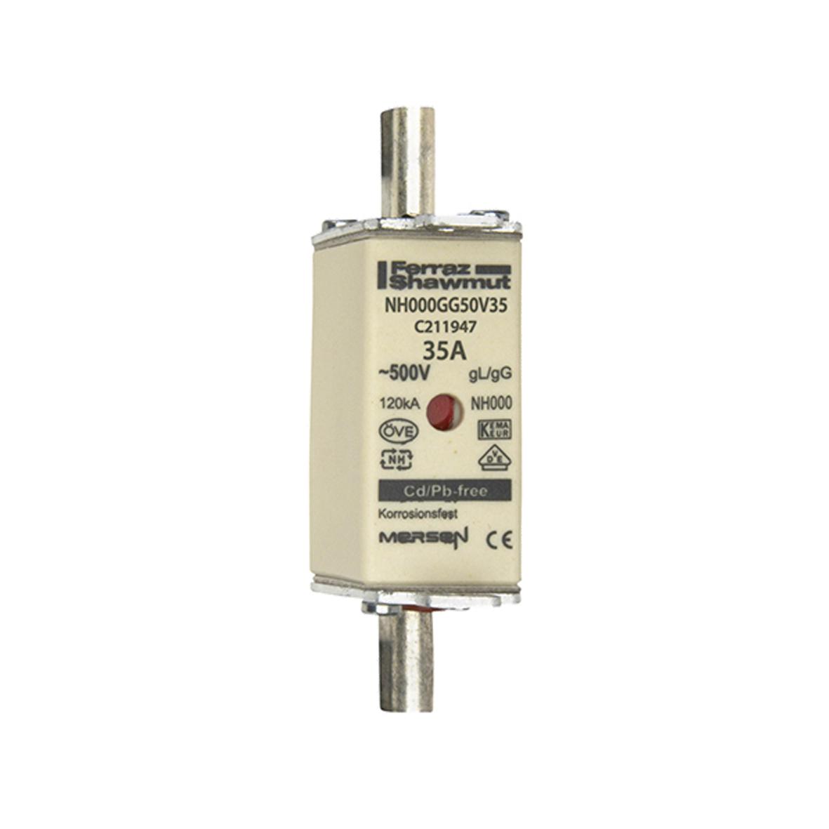 This is 35A NH Fuse NH 000 500V ac manufactured by Mersen. The manufacturer part number is C211947. The product has a current rating of 35a. A fuse with a nh 000 size. Moreover, the product has a nominal 500v ac voltage rating.