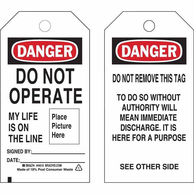 This is manufactured by Brady Corporation. The manufacturer part number is 44510. Label with a size of 5.75" l x 3.00" w (146.0mm x 76.2mm). The product is not applicable. It is shipped in bulk. It has a classic black and red legend, white background colour. The product brady®, is a highly preferred choice for users. The product is made from highly stable and reliable polyester. In addition, it is reach unaffected. Its typical moisture sensitivity level is not applicable. A bespoke label is a do not operate my life is on the line signed by. date, do not remove this tag remarks. label. It has a long 4 weeks standard lead time.