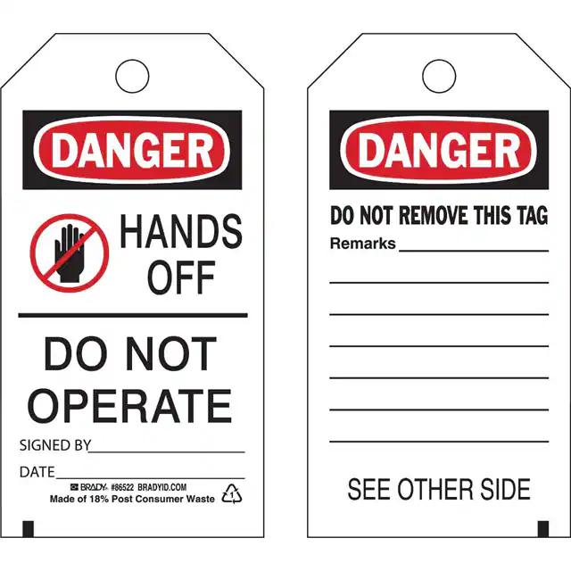 This is manufactured by Brady Corporation. The manufacturer part number is 86522. Label with a size of 5.75" l x 3.00" w (146.0mm x 76.2mm). The product is rohs3 compliant. It is shipped in bulk. It has a classic black and red legend, white background colour. The product brady®, is a highly preferred choice for users. The product is made from highly stable and reliable polyester. In addition, it is reach unaffected. Its typical moisture sensitivity level is not applicable. A bespoke label is a danger. hands off do not operate signed by. date. label. The product is suitable for use with danger. It has a long 4 weeks standard lead time.