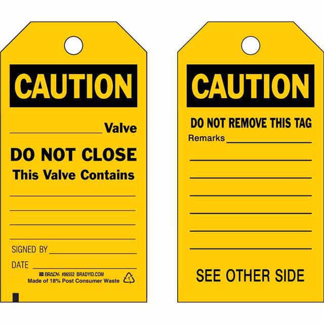 This is manufactured by Brady Corporation. The manufacturer part number is 86552. Label with a size of 5.75" l x 3.00" w (146.0mm x 76.2mm). The product is not applicable. It is shipped in bulk. It has a classic black legend, yellow background colour. The product brady®, is a highly preferred choice for users. The product is made from highly stable and reliable polyester. In addition, it is reach unaffected. Its typical moisture sensitivity level is not applicable. A bespoke label is a caution. valve do not close this valve contains. signed by. date. label. The product is suitable for use with caution. It has a long 4 weeks standard lead time.