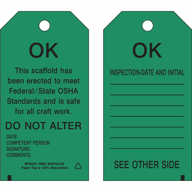This is manufactured by Brady Corporation. The manufacturer part number is 86572. Label with a size of 5.75" l x 3.00" w (146.0mm x 76.2mm). The product is rohs3 compliant. It is shipped in bulk. It has a classic black legend, green background colour. The product brady®, is a highly preferred choice for users. The product is made from highly stable and reliable polyester. In addition, it is reach unaffected. Its typical moisture sensitivity level is not applicable. A bespoke label is a ok this scaffold has been erected to meet federal and state osha standards tags label. It has a long 4 weeks standard lead time.