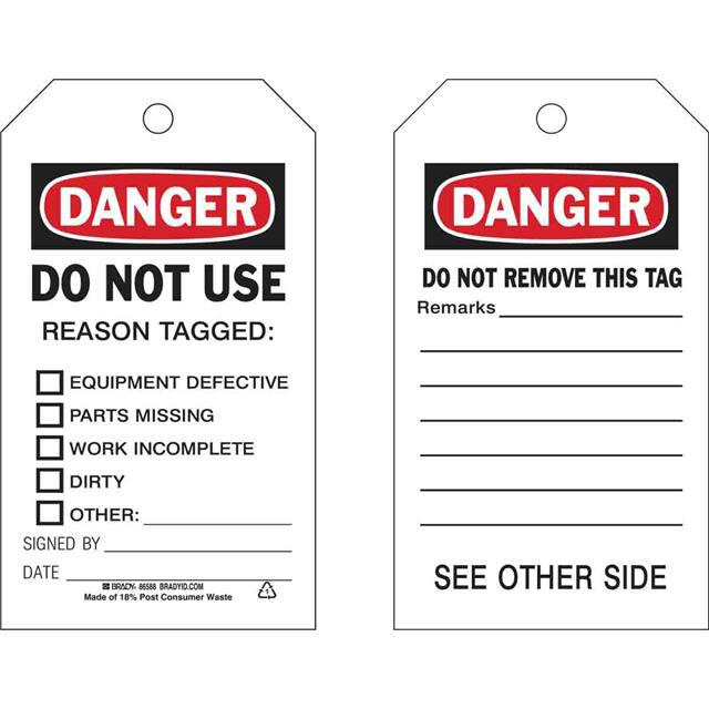This is manufactured by Brady Corporation. The manufacturer part number is 86588. Label with a size of 7.00" l x 4.00" w (177.8mm x 101.6mm). The product is not applicable. It is shipped in bulk. It has a classic black and red legend, white background colour. The product brady®, is a highly preferred choice for users. The product is made from highly stable and reliable polyester. In addition, it is reach unaffected. Its typical moisture sensitivity level is not applicable. A bespoke label is a danger. do not use reason tagged. equipment defective. parts missing. work incomplete. dirty. other signed by. date. label. The product is suitable for use with danger. It has a long 4 weeks standard lead time.