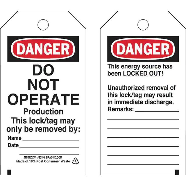 This is manufactured by Brady Corporation. The manufacturer part number is 133551. Label with a size of 5.75" l x 3.00" w (146.0mm x 76.2mm). The product is rohs3 compliant. It is shipped in bulk. It has a classic black and red legend, white background colour. The product brady®, is a highly preferred choice for users. The product is made from highly stable and reliable polyester. In addition, it is reach unaffected. Its typical moisture sensitivity level is not applicable. A bespoke label is a danger. do not operate this lock/tag may only be removedby. name. date. label. The product is suitable for use with danger. It has a long 4 weeks standard lead time.