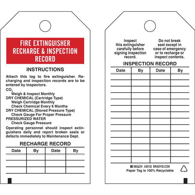 This is manufactured by Brady Corporation. The manufacturer part number is 28732. Label with a size of 5.75" l x 3.00" w (146.0mm x 76.2mm). The product is not applicable. It is shipped in bulk. It has a classic black and red legend, white background colour. The product brady®, is a highly preferred choice for users. The product is made from highly stable and reliable paper. In addition, it is reach unaffected. Its typical moisture sensitivity level is not applicable. A bespoke label is a fire extinguisher recharge and inspection record. instruction sattach this tag to fire extinguisher. recharging and maintenance… label. It has a long 4 weeks standard lead time.