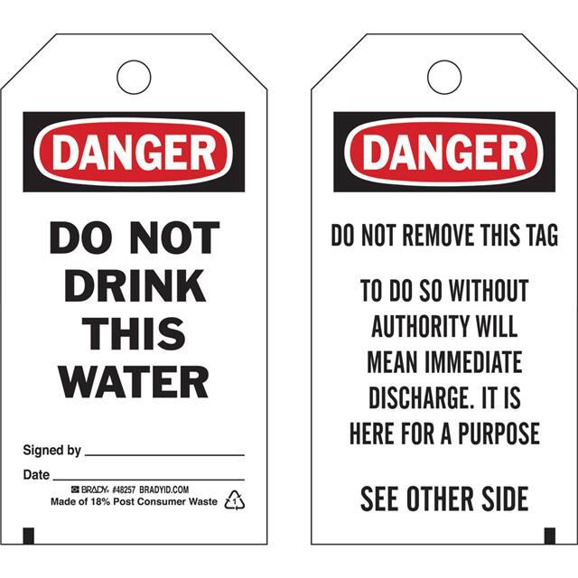 This is manufactured by Brady Corporation. The manufacturer part number is 48256. Label with a size of 5.75" l x 3.00" w (146.0mm x 76.2mm). The product is not applicable. It is shipped in bulk. It has a classic black and red legend, white background colour. The product brady®, is a highly preferred choice for users. The product is made from highly stable and reliable paper. In addition, it is reach unaffected. Its typical moisture sensitivity level is not applicable. A bespoke label is a danger. do not drink this water signed by. date. label. The product is suitable for use with danger. It has a long 4 weeks standard lead time.