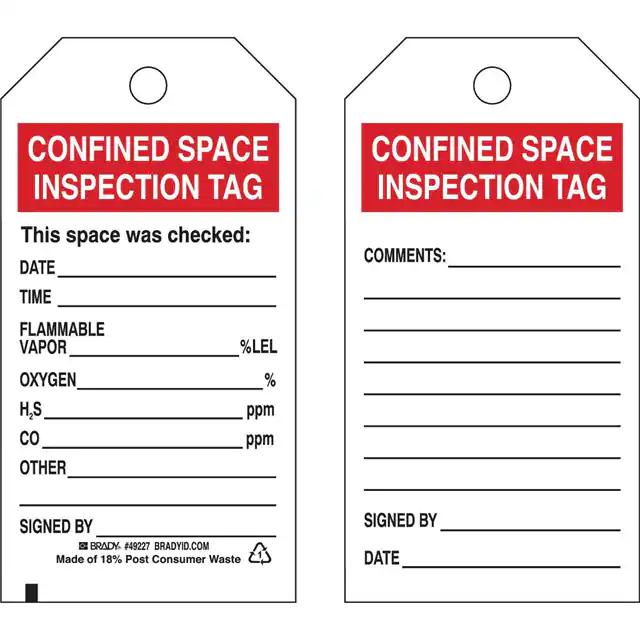 This is manufactured by Brady Corporation. The manufacturer part number is 49227. Label with a size of 5.75" l x 3.00" w (146.0mm x 76.2mm). The product is not applicable. It is shipped in bulk. It has a classic black and red legend, white background colour. The product brady®, is a highly preferred choice for users. The product is made from highly stable and reliable polyester. In addition, it is reach unaffected. Its typical moisture sensitivity level is not applicable. A bespoke label is a confined space inspection tag. this space was checked date. time. flammable vapor. label. It has a long 4 weeks standard lead time.