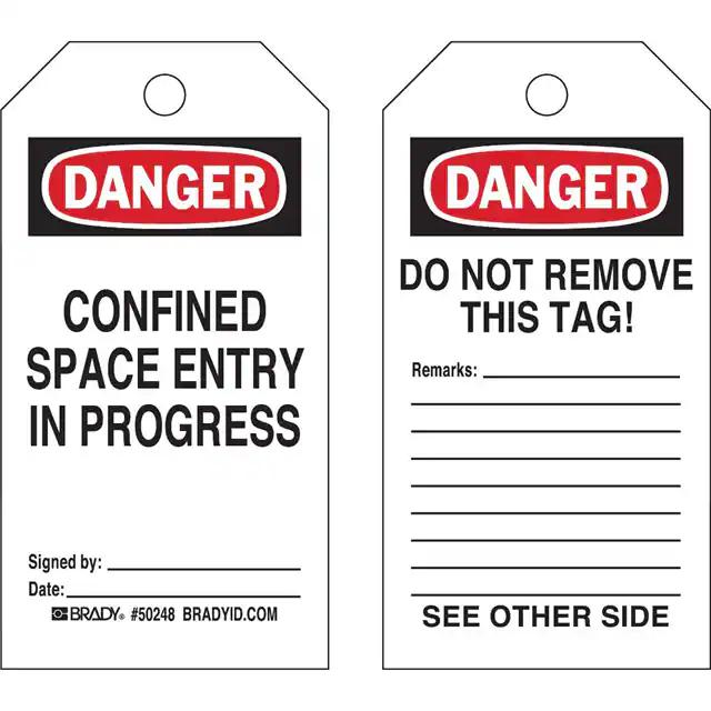 This is manufactured by Brady Corporation. The manufacturer part number is 50248. Label with a size of 5.75" l x 3.00" w (146.0mm x 76.2mm). The product is rohs3 compliant. It is shipped in bulk. It has a classic black and red legend, white background colour. The product brady®, is a highly preferred choice for users. The product is made from highly stable and reliable polyester. In addition, it is reach unaffected. Its typical moisture sensitivity level is not applicable. A bespoke label is a danger. confined space entry in progress signedby. date. label. The product is suitable for use with danger. It has a long 4 weeks standard lead time.
