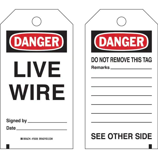 This is manufactured by Brady Corporation. The manufacturer part number is 76205. Label with a size of 5.75" l x 3.00" w (146.0mm x 76.2mm). The product is not applicable. It is shipped in bulk. It has a classic black and red legend, white background colour. The product brady®, is a highly preferred choice for users. The product is made from highly stable and reliable polyester. In addition, it is reach unaffected. Its typical moisture sensitivity level is not applicable. A bespoke label is a danger. live wire signed by. date. label. The product is suitable for use with danger. It has a long 4 weeks standard lead time.
