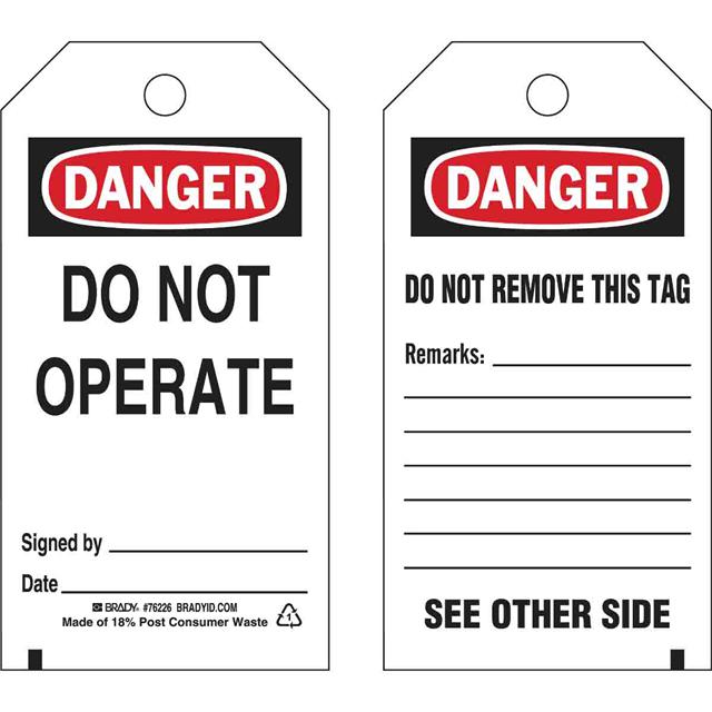 This is manufactured by Brady Corporation. The manufacturer part number is 76226. Label with a size of 5.75" l x 3.00" w (146.0mm x 76.2mm). The product is rohs3 compliant. It is shipped in bulk. It has a classic black and red legend, white background colour. The product brady®, is a highly preferred choice for users. The product is made from highly stable and reliable polyester. In addition, it is reach unaffected. Its typical moisture sensitivity level is not applicable. A bespoke label is a danger. do not operate signed by. date. label. The product is suitable for use with danger. It has a long 4 weeks standard lead time.