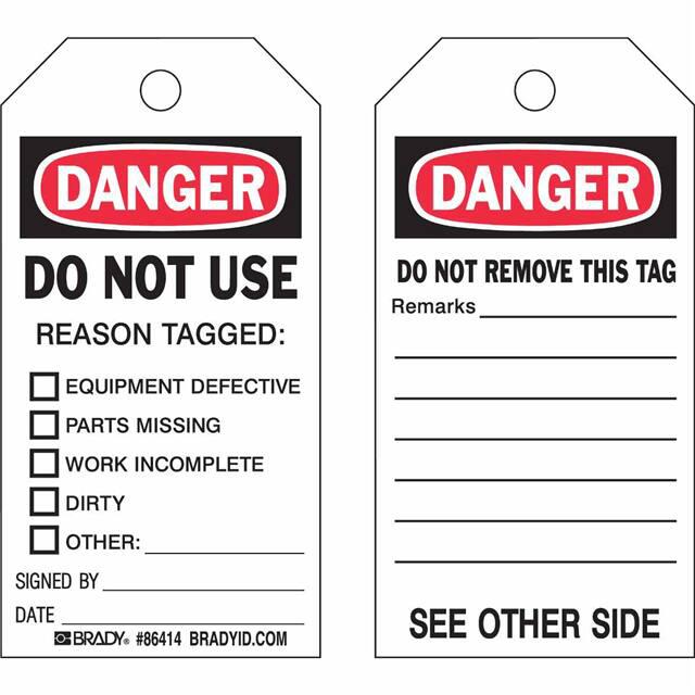 This is manufactured by Brady Corporation. The manufacturer part number is 86414. Label with a size of 5.75" l x 3.00" w (146.0mm x 76.2mm). The product is rohs3 compliant. It is shipped in bulk. It has a classic black and red legend, white background colour. The product brady®, is a highly preferred choice for users. The product is made from highly stable and reliable polyester. In addition, it is reach unaffected. Its typical moisture sensitivity level is not applicable. A bespoke label is a danger. do not use reason tagged. equipment defective. parts missing. work incomplete. dirty. other signed by. date. label. The product is suitable for use with danger. It has a long 4 weeks standard lead time.