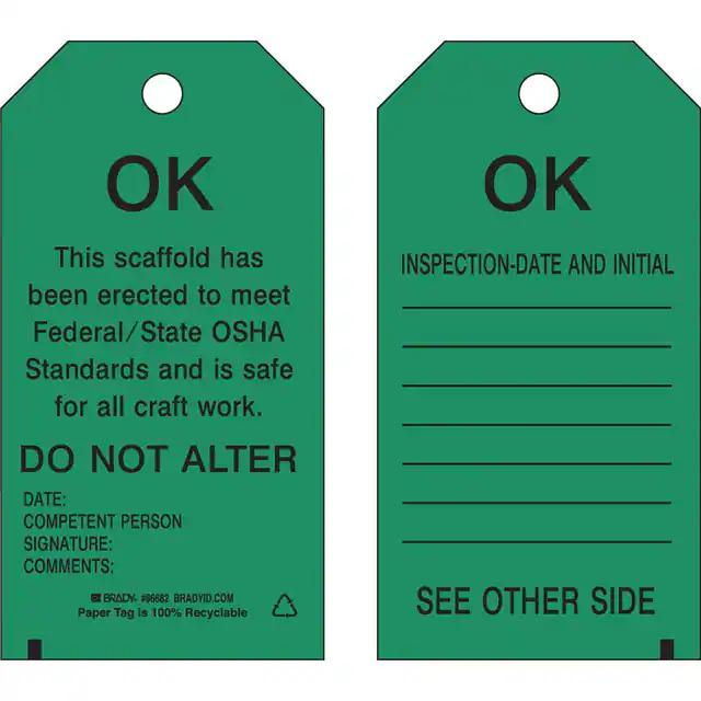 This is manufactured by Brady Corporation. The manufacturer part number is 86452. Label with a size of 5.75" l x 3.00" w (146.0mm x 76.2mm). The product is rohs3 compliant. It is shipped in bulk. It has a classic black legend, green background colour. The product brady®, is a highly preferred choice for users. The product is made from highly stable and reliable polyester. In addition, it is reach unaffected. Its typical moisture sensitivity level is not applicable. A bespoke label is a ok. this scaffold has been erected to meet federal/state osha standards and is safe for all craft work. do not alter date. com… label. It has a long 4 weeks standard lead time.