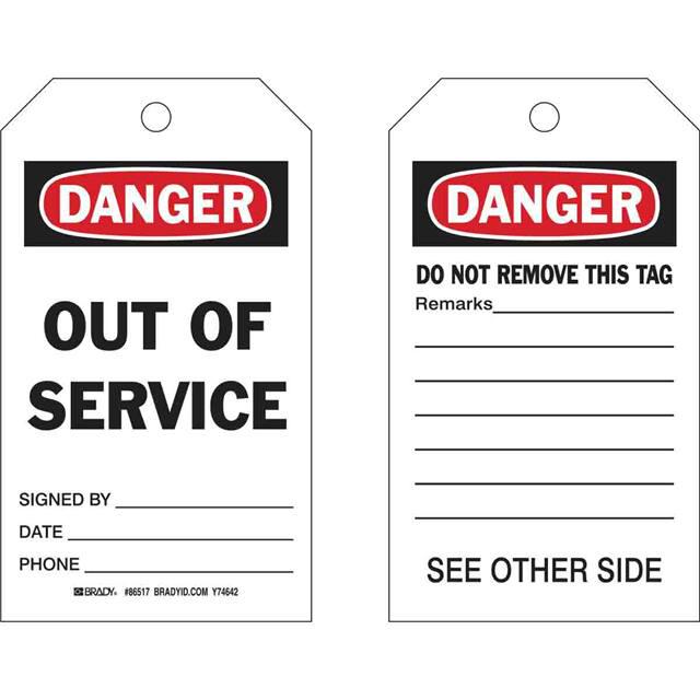 This is manufactured by Brady Corporation. The manufacturer part number is 86517. Label with a size of 7.00" l x 4.00" w (177.8mm x 101.6mm). The product is not applicable. It is shipped in bulk. It has a classic black and red legend, white background colour. The product brady®, is a highly preferred choice for users. The product is made from highly stable and reliable polyester. In addition, it is reach unaffected. Its typical moisture sensitivity level is not applicable. A bespoke label is a danger. out of service signed by. date. phone. label. The product is suitable for use with danger. It has a long 4 weeks standard lead time.