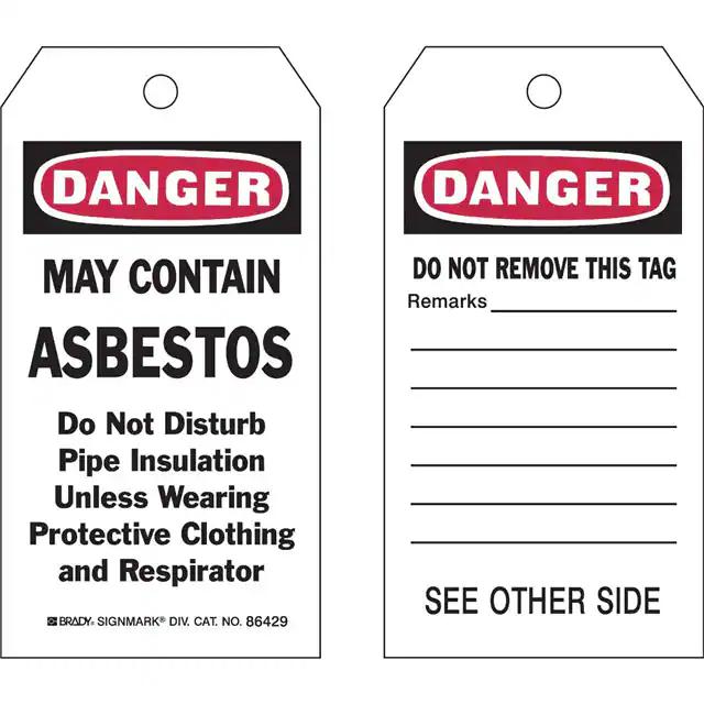 This is manufactured by Brady Corporation. The manufacturer part number is 86658. Label with a size of 5.75" l x 3.00" w (146.0mm x 76.2mm). The product is not applicable. It is shipped in bulk. It has a classic black and red legend, white background colour. The product brady®, is a highly preferred choice for users. The product is made from highly stable and reliable paper. In addition, it is reach unaffected. Its typical moisture sensitivity level is not applicable. A bespoke label is a danger. may contain asbestos do not disturb pipe insulation unless wearing protective clothing and respirator label. The product is suitable for use with danger. It has a long 4 weeks standard lead time.