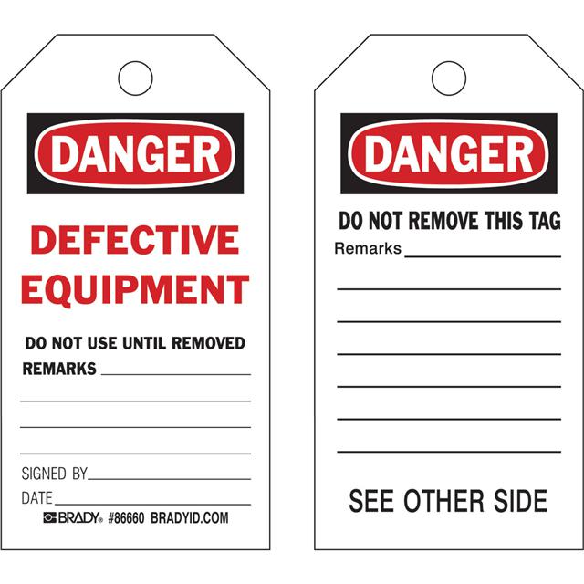 This is manufactured by Brady Corporation. The manufacturer part number is 86660. Label with a size of 5.75" l x 3.00" w (146.0mm x 76.2mm). The product is not applicable. It is shipped in bulk. It has a classic black and red legend, white background colour. The product brady®, is a highly preferred choice for users. The product is made from highly stable and reliable paper. In addition, it is reach unaffected. Its typical moisture sensitivity level is not applicable. A bespoke label is a danger. defective equipment do not use until removed remarks. signed by. date. label. The product is suitable for use with danger. It has a long 4 weeks standard lead time.