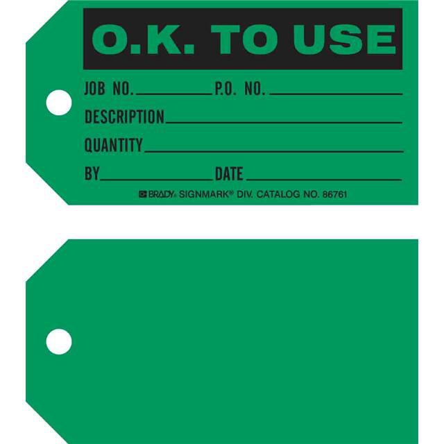This is manufactured by Brady Corporation. The manufacturer part number is 86761. Label with a size of 5.75" l x 3.00" w (146.0mm x 76.2mm). The product is rohs3 compliant. It is shipped in bulk. It has a classic black legend, green background colour. The product brady®, is a highly preferred choice for users. The product is made from highly stable and reliable paper. In addition, it is reach unaffected. Its typical moisture sensitivity level is not applicable. A bespoke label is a o. k. to use. job no. po no. description. quantity. by. date. label. It has a long 4 weeks standard lead time.