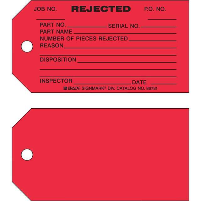 This is manufactured by Brady Corporation. The manufacturer part number is 86781. Label with a size of 5.75" l x 3.00" w (146.0mm x 76.2mm). The product is rohs3 compliant. It is shipped in bulk. It has a classic black legend, red background colour. The product brady®, is a highly preferred choice for users. The product is made from highly stable and reliable paper. In addition, it is reach unaffected. Its typical moisture sensitivity level is not applicable. A bespoke label is a rejected. part no. serial no. part name. number of pieces rejected. reason. disposition. inspector. date. label. It has a long 4 weeks standard lead time.