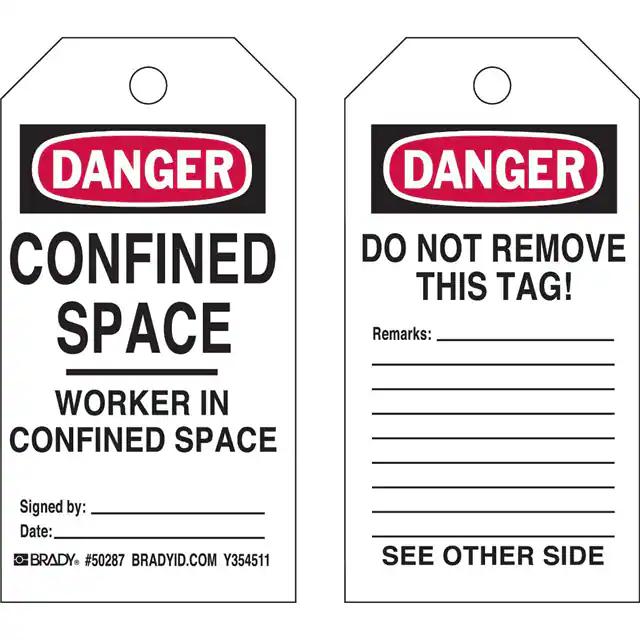 This is manufactured by Brady Corporation. The manufacturer part number is 50287. Label with a size of 5.75" l x 3.00" w (146.0mm x 76.2mm). It is shipped in bulk. It has a classic black and red legend, white background colour. The product brady®, is a highly preferred choice for users. The product is made from highly stable and reliable polyester. In addition, it is reach unaffected. Its typical moisture sensitivity level is not applicable. A bespoke label is a danger. confined space worker in confined space signedby. date. label. The product is suitable for use with danger. It has a long 4 weeks standard lead time.