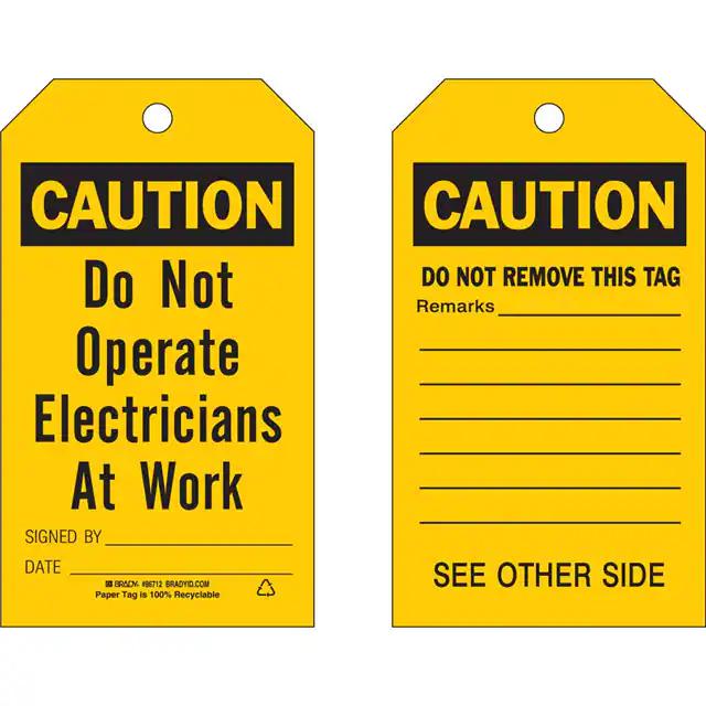 This is manufactured by Brady Corporation. The manufacturer part number is 86712. Label with a size of 7.00" l x 4.00" w (177.8mm x 101.6mm). The product is not applicable. It is shipped in bulk. It has a classic black legend, yellow background colour. The product brady®, is a highly preferred choice for users. The product is made from highly stable and reliable paper. In addition, it is reach unaffected. Its typical moisture sensitivity level is not applicable. A bespoke label is a caution. do not operate electricians at work signed by. date. label. The product is suitable for use with caution. It has a long 4 weeks standard lead time.