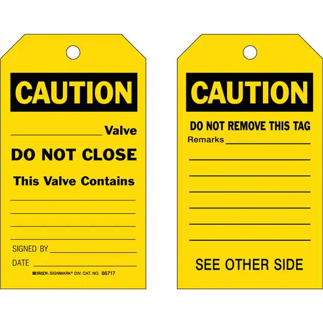 This is manufactured by Brady Corporation. The manufacturer part number is 86717. Label with a size of 7.00" l x 4.00" w (177.8mm x 101.6mm). The product is not applicable. It is shipped in bulk. It has a classic black legend, yellow background colour. The product brady®, is a highly preferred choice for users. The product is made from highly stable and reliable paper. In addition, it is reach unaffected. Its typical moisture sensitivity level is not applicable. A bespoke label is a caution. valve do not close this valve contains. signed by. date. label. The product is suitable for use with caution. It has a long 4 weeks standard lead time.