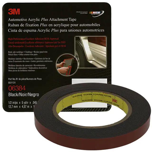 This is manufactured by 3M. The manufacturer part number is 06384. The product is a splendid acrylic adhesive. It is assigned with possible HTSUS value of 3919.10.2055. The product is rohs compliant. It is 0.0450" (45.0 mils, 1.143mm) thick. Furthermore, the product is 0.50" (12.70mm) 1/2" wide. This highly innovate tape is a double coated, double sided with effective applications. The product's typical Applications include uses in automotive. It is shipped in bulk. The product backing is made from an excellent liner. Its typical moisture sensitivity level is not applicable. Its accurate length is 15' (4.6m) 5 yds. It has a long 6 weeks standard lead time. It has a classic black colour. The product is designated with the ear99 code number