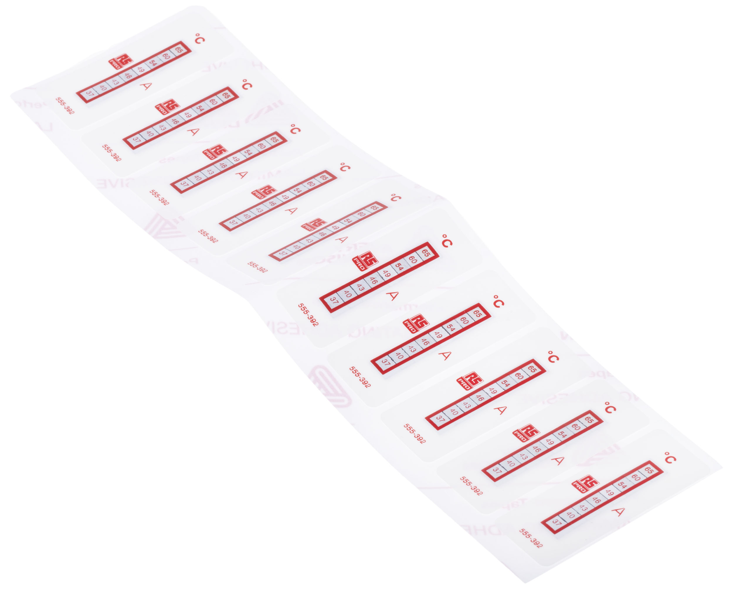 This is Temperature Sensitive Label 37°C to 65°C 8 Level 51 x 18mm manufactured by RS Pro. The manufacturer part number is 555-392. The product has a vertical orientation.