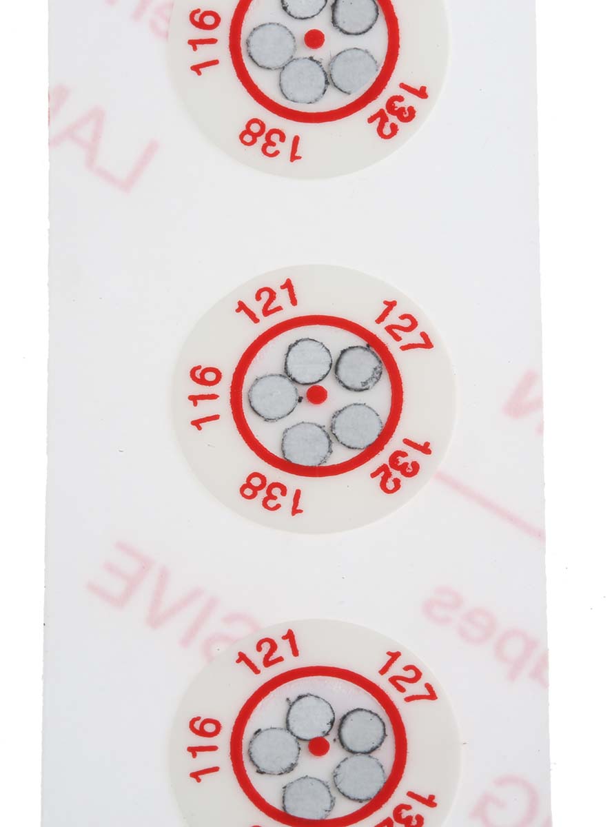 This is Non-Reversible Temperature Sensitive Label 116°C to 138°C 5 Levels manufactured by RS Pro. The manufacturer part number is 285-992. The product has a circle orientation.