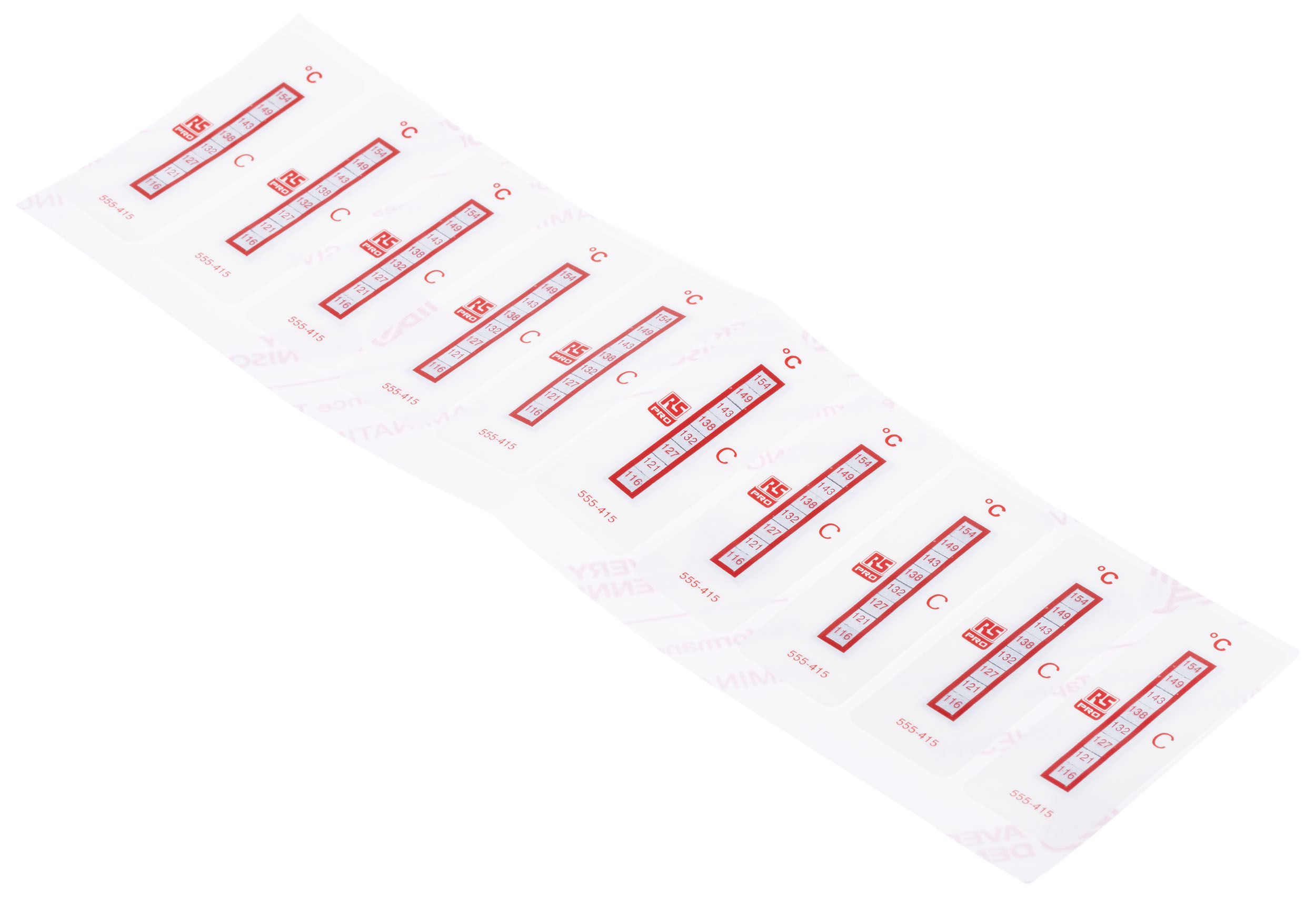 This is Non-Reversible Temperature Sensitive Label 116°C to 154°C 8 Levels manufactured by RS Pro. The manufacturer part number is 555-415. The product has a vertical orientation.