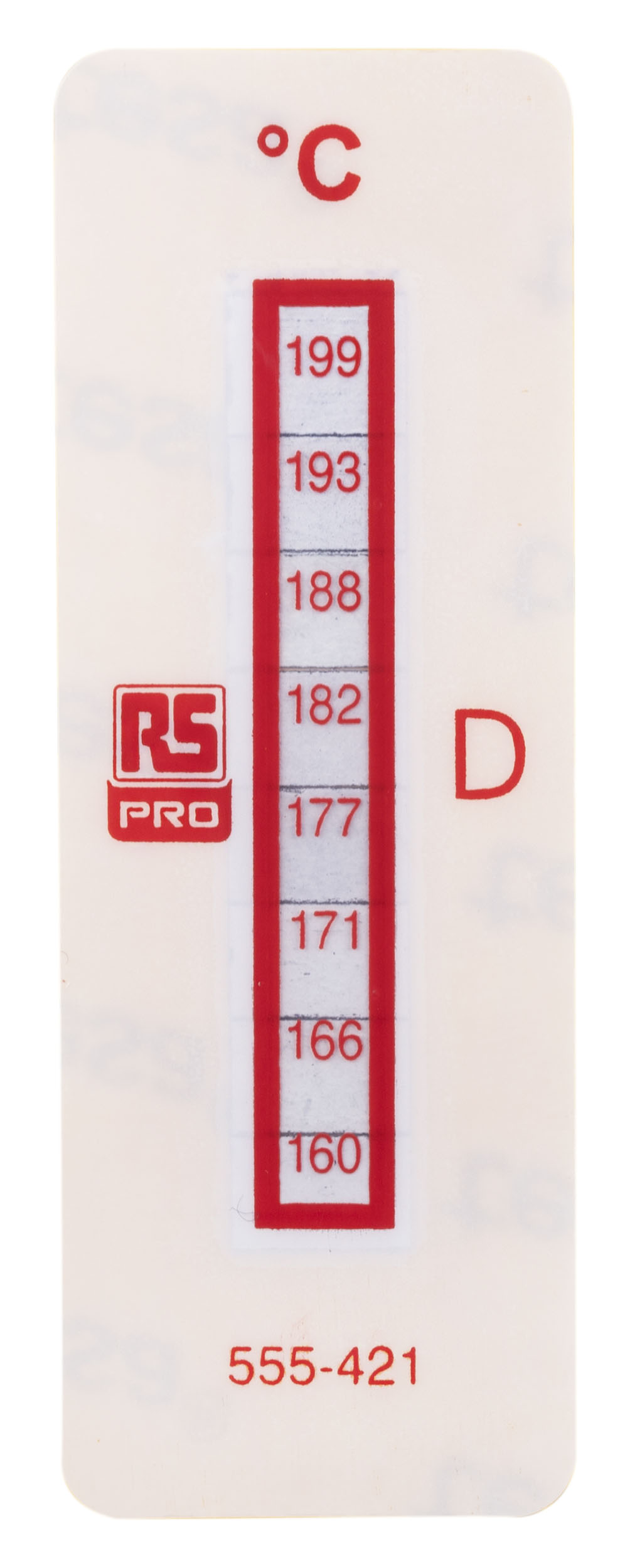 This is Non-Reversible Temperature Sensitive Label 160°C to 199°C 8 Levels manufactured by RS Pro. The manufacturer part number is 555-421. The product has a vertical orientation.