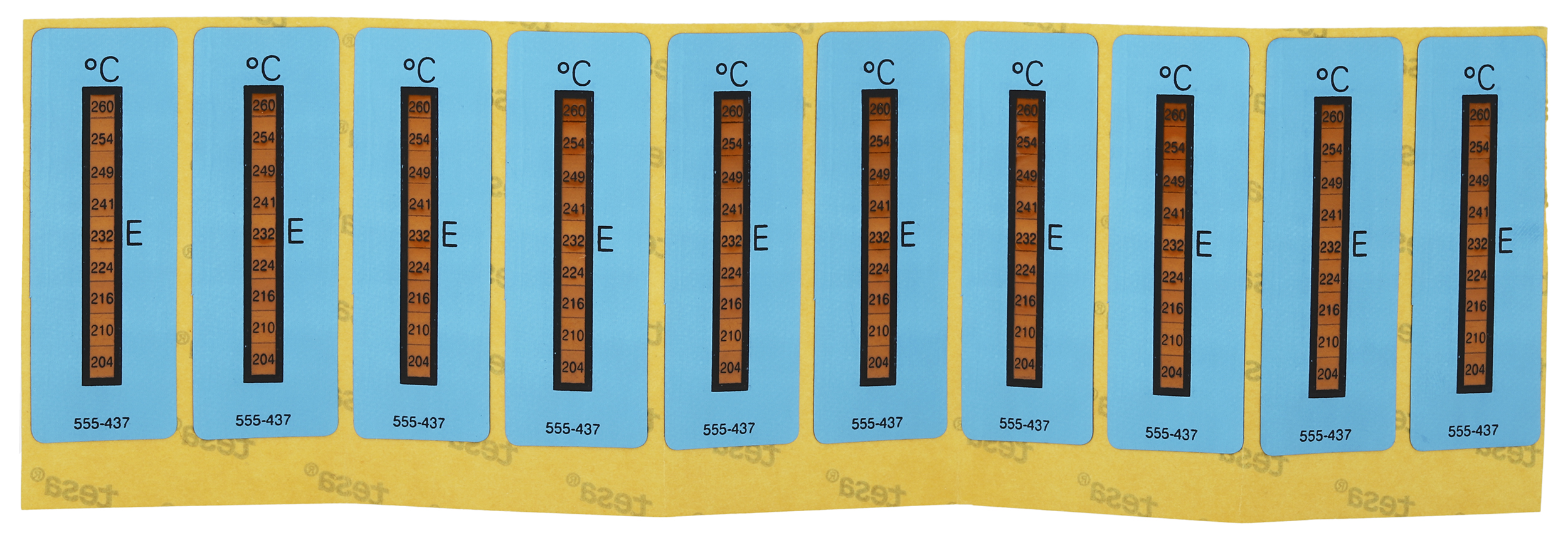 This is Non-Reversible Temperature Sensitive Label 204°C to 260°C 8 Levels manufactured by RS Pro. The manufacturer part number is 555-437. The product has a vertical orientation.
