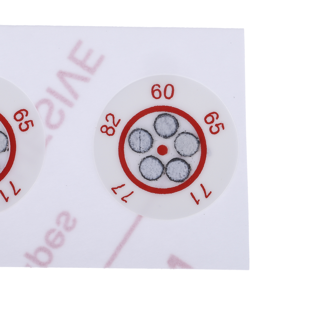 This is Non-Reversible Temperature Sensitive Label 60°C to 82°C 5 Levels manufactured by RS Pro. The manufacturer part number is 285-970. The product has a circle orientation.
