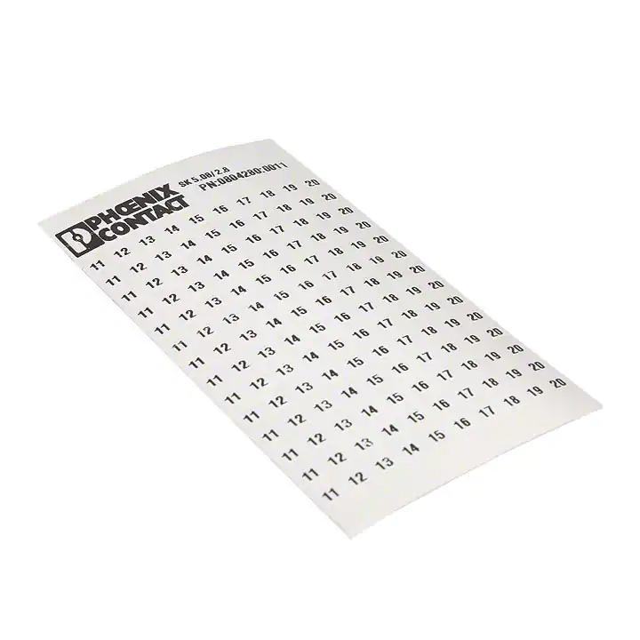 This is manufactured by Phoenix Contact. The manufacturer part number is 0804280:0011. It is assigned with possible HTSUS value of 4823.90.8680. It is shipped in bulk. It has a classic white colour. The product clipline sk, is a highly preferred choice for users. The product is rohs compliant. Its typical moisture sensitivity level is not applicable. The product is suitable for use with clipline series. Moreover, the product is 0.200" (5.08mm) It has a long 4 weeks standard lead time. It comes in label, adhesive configuration. Legend Information: numbers, 11 through 20. The product is designated with the ear99 code number