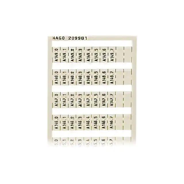 This is manufactured by WAGO Corporation. The manufacturer part number is 209-981. It is assigned with possible HTSUS value of 3926.90.9985. It is shipped in box. It has a classic white colour. The product wsb, is a highly preferred choice for users. The product is rohs3 compliant. Its typical moisture sensitivity level is not applicable. The product is suitable for use with 5mm wide terminal blocks. It has a long 12 weeks standard lead time. It comes in label, snap in configuration. Legend Information: a140.0 through a149.7. The product is designated with the ear99 code number