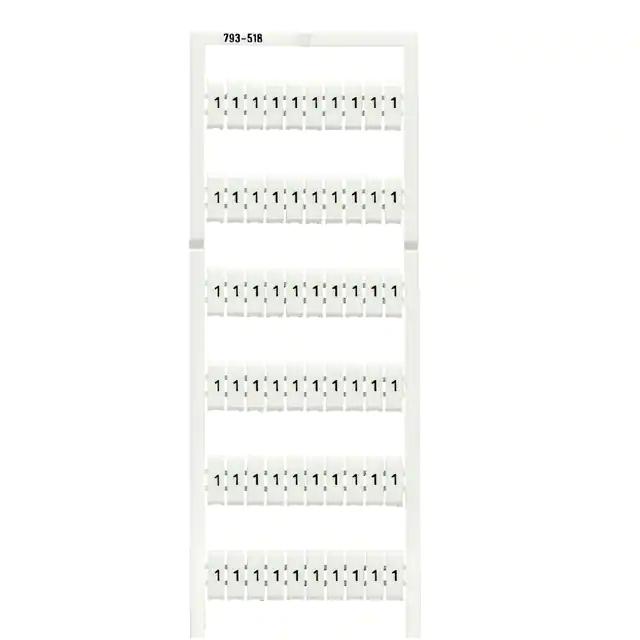 This is manufactured by WAGO Corporation. The manufacturer part number is 793-518. It is assigned with possible HTSUS value of 3926.90.9985. It is shipped in bag. It has a classic white colour. The product wmb, is a highly preferred choice for users. The product is rohs3 compliant. Its typical moisture sensitivity level is not applicable. The product is suitable for use with 5mm wide terminal blocks. It has a long 12 weeks standard lead time. It comes in label, snap in configuration. Legend Information: numbers, 1 and 2. The product is designated with the ear99 code number