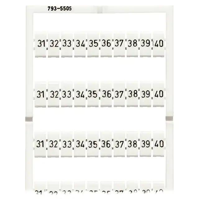 This is manufactured by WAGO Corporation. The manufacturer part number is 793-5505. It is assigned with possible HTSUS value of 3926.90.9985. It is shipped in bag. It has a classic white colour. The product wmb, is a highly preferred choice for users. The product is rohs3 compliant. Its typical moisture sensitivity level is not applicable. The product is suitable for use with 5mm wide terminal blocks. It has a long 12 weeks standard lead time. It comes in label, snap in configuration. Legend Information: numbers, 31 through 40. The product is designated with the ear99 code number