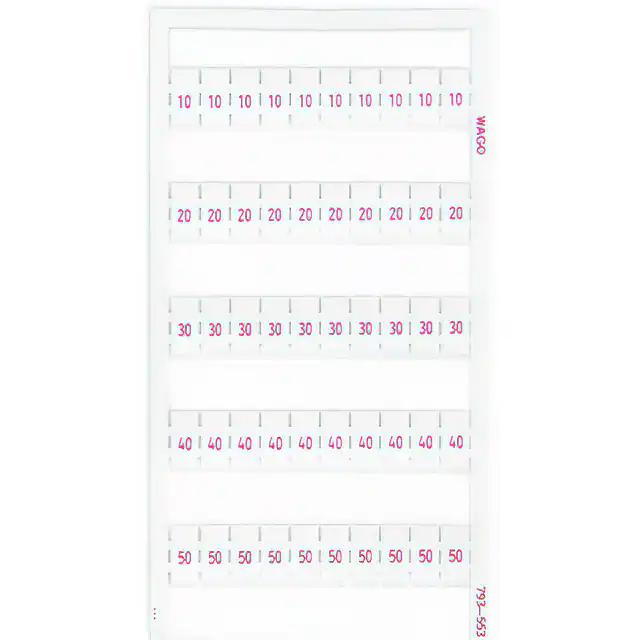 This is manufactured by WAGO Corporation. The manufacturer part number is 793-553. It is assigned with possible HTSUS value of 3926.90.9985. It is shipped in box. It has a classic white colour. The product wmb, is a highly preferred choice for users. The product is rohs3 compliant. Its typical moisture sensitivity level is not applicable. The product is suitable for use with 5mm wide terminal blocks. It has a long 12 weeks standard lead time. It comes in label, snap in configuration. Legend Information: numbers, 10, 20…50. The product is designated with the ear99 code number