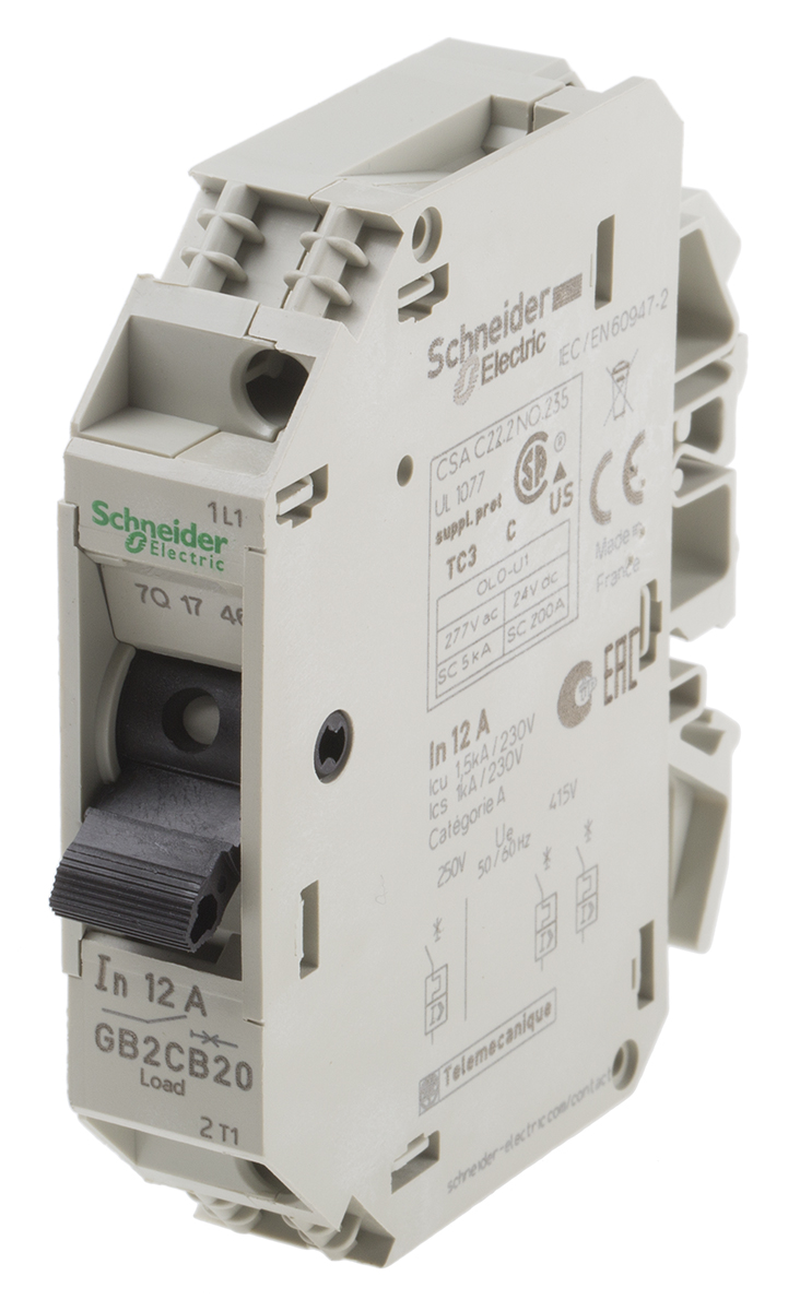 This is 12A 1P Pole Thermal Magnetic Circuit Breaker 277 V ac 415 V ac GB2 manufactured by Schneider Electric. The manufacturer part number is GB2CB20. The product has a current rating of 12a. Moreover, the product has a nominal 277 v ac, 415v ac voltage rating. The product gb2, is a highly preferred choice for users. Furthermore, the product is 15mm wide. It has equipped with 1 poles.