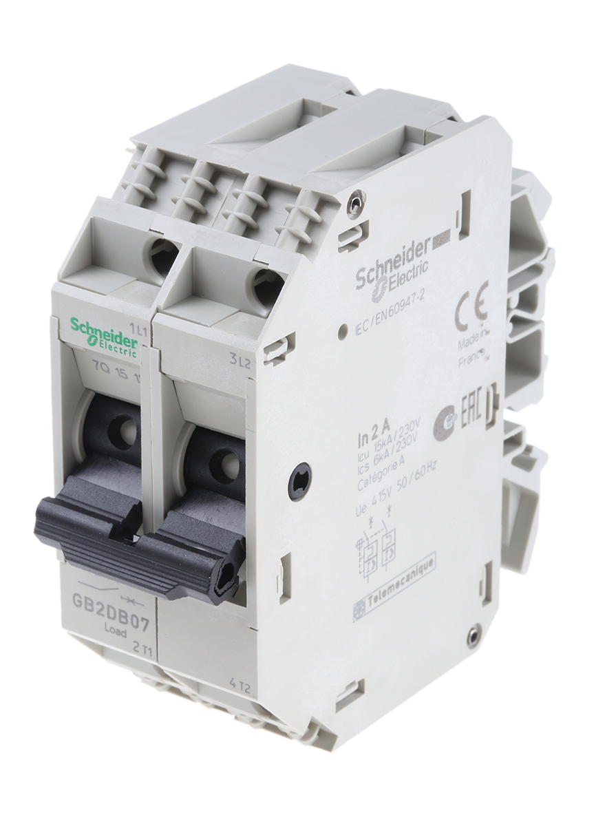 This is 2A 2P Pole Thermal Magnetic Circuit Breaker 277 V ac 415 V ac GB2 manufactured by Schneider Electric. The manufacturer part number is GB2DB07. The product has a current rating of 2a. Moreover, the product has a nominal 277 v ac, 415v ac voltage rating. The product gb2, is a highly preferred choice for users. Furthermore, the product is 30mm wide. It has equipped with 2 poles.