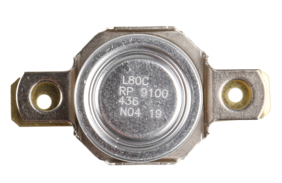 This is NC 10 A Bi-Metallic Thermostat Opens at+80°C manufactured by Honeywell. The manufacturer part number is 2455RP 9100-436 L80C. The terminal is a solder tab type.