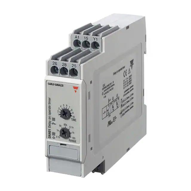 This is manufactured by Carlo Gavazzi Inc.. The manufacturer part number is DAA01CM24. It is assigned with possible HTSUS value of 9107.00.8000. The product is rohs compliant. This is basically a mechanical relay. Moreover, it has screw terminal terminal style. It performs basic function of on-delay. In addition, it is reach unaffected. It is shipped in box. Its typical moisture sensitivity level is not applicable. It has an integral spdt (1 form c) circuit. The given contact rating of the product and its voltage includes 8a @ 250vac. It has a long 6 weeks standard lead time. A product has a 0.1 sec ~ 100 hrs delay time. The product is available in din rail configuration. The product daa01, is a highly preferred choice for users. It has optimum voltage supply of 24 ~ 240vac, 24vdc. Moreover, it corresponds to daa01, a base product number of the product. The product is designated with the ear99 code number