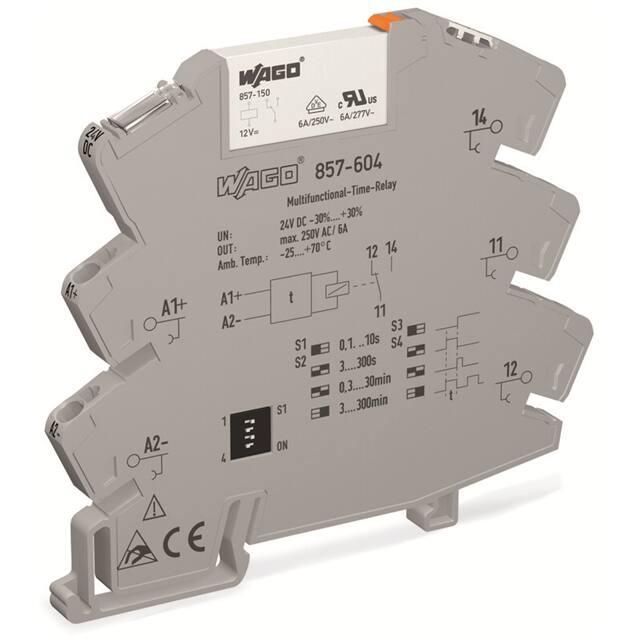 This is manufactured by WAGO Corporation. The manufacturer part number is 857-604. The product is rohs3 compliant. This is basically a mechanical relay. Moreover, it has spring terminal terminal style. It performs basic function of programmable (multi-function). It is shipped in bag. Its typical moisture sensitivity level is not applicable. It has an integral spdt (1 form c) circuit. The given contact rating of the product and its voltage includes 6a @ 250vac. It has a long 12 weeks standard lead time. A product has a 0.1 sec ~ 300 min delay time. The product is available in din rail configuration. It has optimum voltage supply of 24vdc.