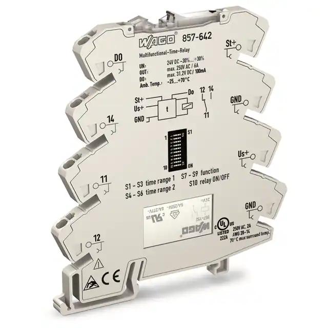 This is manufactured by WAGO Corporation. The manufacturer part number is 857-642. The product is rohs3 compliant. This is basically a mechanical relay. Moreover, it has spring terminal terminal style. It performs basic function of programmable (multi-function). It is shipped in bag. Its typical moisture sensitivity level is not applicable. It has an integral spdt (1 form c) circuit. The given contact rating of the product and its voltage includes 6a @ 250vac. It has a long 12 weeks standard lead time. A product has a 0.01 sec ~ 100 hrs delay time. The product is available in din rail configuration. It has optimum voltage supply of 24vdc.