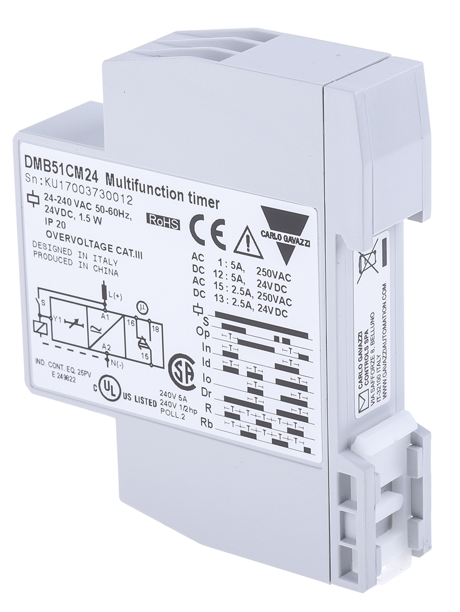 This is Multi Function Timer Relay Screw 0.1 s → 100 h SPDT 2 Contacts SPDT manufactured by Carlo Gavazzi. The manufacturer part number is DMB51CM24. The product is available in din rail configuration. Its accurate length is 67.2mm. Furthermore, the product is 17.5mm wide. The product comes in 81mm depth. Whereas, the minimum operating temperature of the product is -20°c. The product contains 2 contacts. It has a maximum operating temperature of +60°c. The terminal is a screw type. The product is made from sturdy silver tin oxide materials.