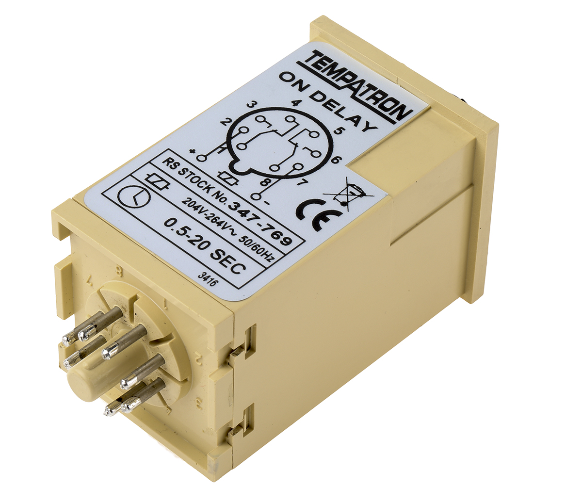 This is ON Delay Energise Single Timer Relay 8-Pin Connector 0.5 → 20 s DP-NO/NC 2 Contacts DPDT 230 V ac manufactured by Tempatron. The manufacturer part number is FBDE20SLP230VAC. The product is available in din rail, panel mount configuration. Its accurate length is 48mm. Furthermore, the product is 48mm wide. The product comes in 106mm depth. Whereas, the minimum operating temperature of the product is -10°c. The product contains 2 contacts. It has a maximum operating temperature of +60°c. The terminal is a 8-pin connector type. The product is made from sturdy silver alloy materials.