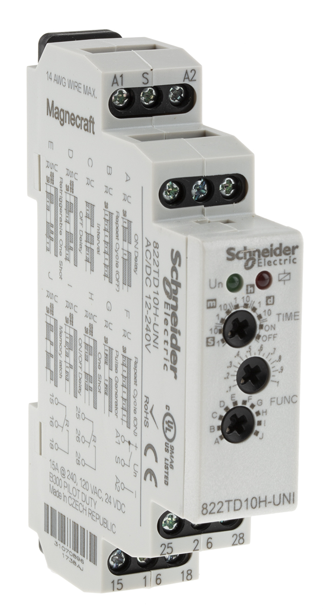 This is Multi Function Timer Relay Screw 100 ms → 10 days DPDT 2 Contacts DPDT manufactured by Schneider Electric. The manufacturer part number is 822TD10H-UNI. The product is available in din rail configuration. Its accurate length is 90mm. Furthermore, the product is 17.6mm wide. The product comes in 65mm depth. Whereas, the minimum operating temperature of the product is -20°c. The product contains 2 contacts. It has a maximum operating temperature of +55°c. The terminal is a screw type. The product is made from sturdy silver alloy materials.