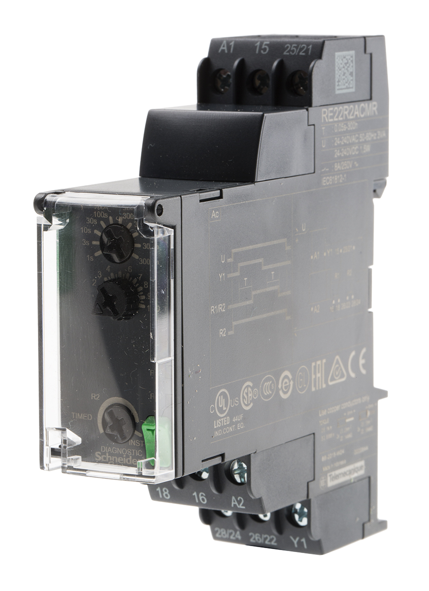 This is Off Delay On Delay Multi Function Timer Relay Screw manufactured by Schneider Electric. The manufacturer part number is RE22R2ACMR. Furthermore, the product is 90mm wide. It has a maximum operating temperature of +60°c. The terminal is a screw type. Its accurate length is 22.9mm. The product is available in din rail configuration. The product re22 r2, is a highly preferred choice for users. The product comes in 79.5mm depth. Whereas, the minimum operating temperature of the product is -20°c. The product contains 2 contacts.